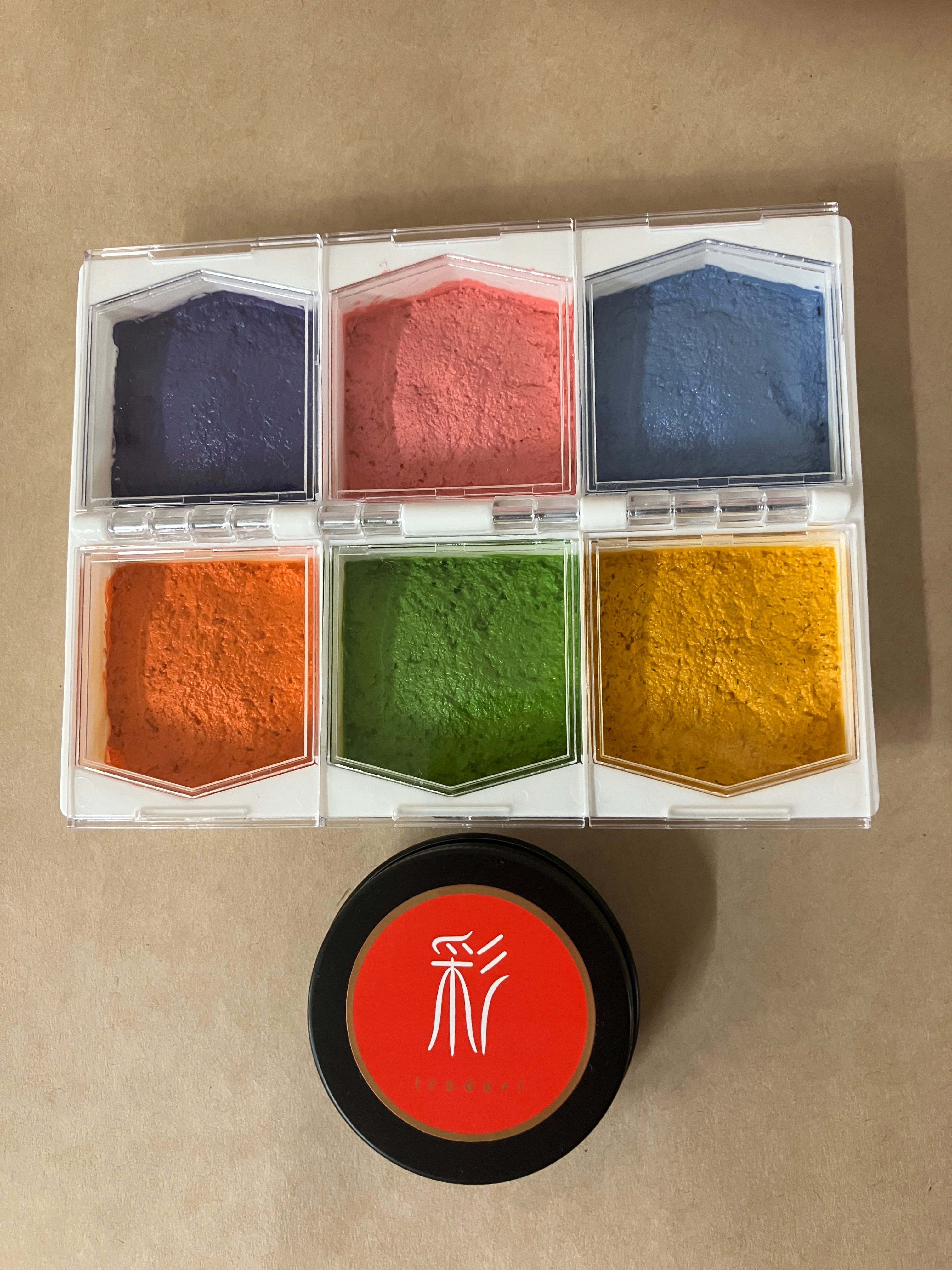 自分好みの彩朱肉13色+白・黒の15色より6色セレクトして一つの容器に詰めました。(容量は各15g)